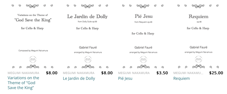 その他、私がこれまでに編曲したものの一部をアメリカのハープ編曲譜面専門サイト"Harp Column Music"にて販売しております。